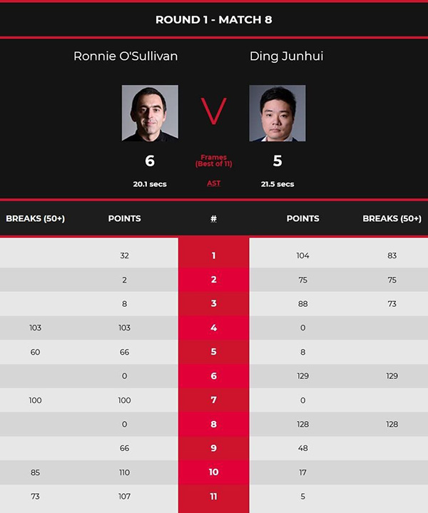 第七局丁俊晖防守留下机会,奥沙利文打进红球中袋,打出本场个人第二杆破百,攻下100分零封又追上一局。,第八局丁俊晖单杆128分清台并还以颜色,以5-3率先拿到赛点。