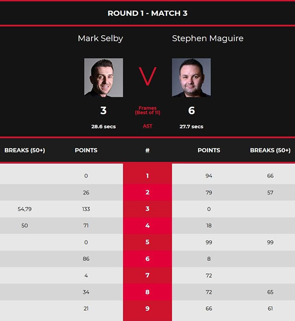 首局比赛中,马奎尔两次上手机会,单杆28分、单杆66分拿下。第二局,马奎尔的做球让塞尔比苦笑,塞尔比大力解球留下机会,马奎尔凭借单杆57分以79-56拿下。马奎尔2-0。第三局,塞尔比两次上手机会,单杆54分、单杆79分拿下。第四局,塞尔比两次机会,单杆50分、单杆17分,以71-18拿下。双方2-2。