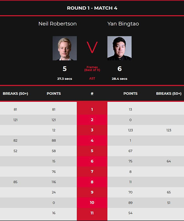 首局比赛,颜丙涛率先上手,在击打第二颗红球时走位失误,给罗伯逊留下机会,后者上手打出单杆81分。第二局,罗伯逊延续火热手感,单杆121分再下一局,大比分2-0领先颜丙涛。第三局,罗伯逊打散红球堆时留下机会,颜丙涛上手打出单杆123分扳回一局。第四局,罗伯逊长台进攻打进红球上手,单杆打出82分拿下胜利,大比分3-1领先进入局间休息。