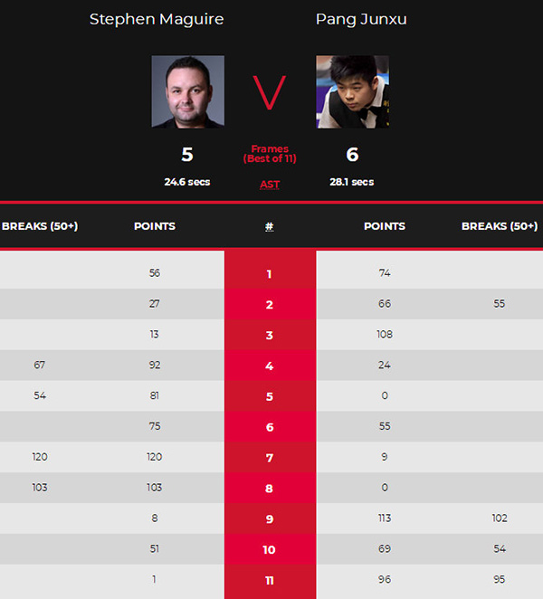 庞俊旭绝对是本赛季中国斯诺克的一个惊喜。作为首次征战职业赛的新人,庞俊旭本赛季在欧洲大师赛打进16强,在德国大师赛打进正赛;在本场比赛开始前已经战胜过马克·艾伦、巴里·霍金斯、汤姆·福德、里奇·沃顿等斯诺克名将。昨晚,在英国锦标赛第3轮的对阵中,他战胜的对手中再添一员猛将——上赛季英锦赛亚军、世界排名第9位的斯蒂芬·马奎尔。
