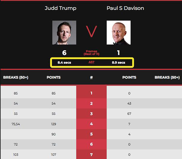 从全场来看,特鲁姆普状态并非最佳,但对手实力太有限,世界第1赢得也是比较轻松,没有遇到太大挑战。更让人惊讶的是,本场比赛,特鲁姆普的平均出杆速度只有8.4秒,这是什么概念?几乎没有思考,拿起来就打啊!或许是在特鲁姆普的带动下,戴维森的平均出杆速度也只有8.9秒。如此的一场比赛,快得不行,恐怕奥沙利文都难以做到。