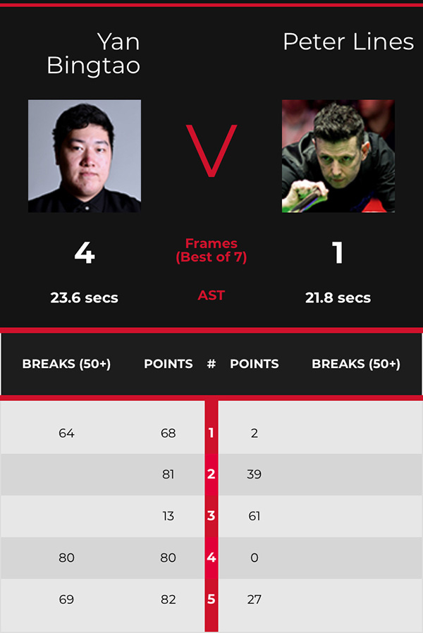 第二局,颜丙涛通过几次上手,81-39再胜一局,2-0领先。第三局,连输两局之后,莱恩斯终于有所斩获,他以61-13扳回一局,比分追成2-1。第四局,颜丙涛重新找回优势,他的单杆80分制胜,比分优势扩大到3-1,并赢得本场比赛的赛点。