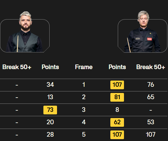 面临赛点的压力,莱恩斯可能心态上出现了一些波动。罗伯逊则一鼓作气,再次展现出强大的进攻能力,迅速建立起领先优势,并将优势保持到了最后,顺利拿下第五局,从而以 4-1 的比分战胜奥利弗-莱恩斯,晋级下一轮。
