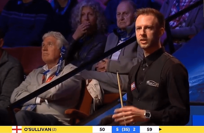 比赛进行到第一阶段最后一局第8局,奥沙利文5-2领先。在最后阶段一次解球失误之后,奥沙利文回到座位。特鲁姆普准备击球,但此时裁判叫停比赛,来到奥沙利文的座位上和他进行交流。但显然,两人的交流并不愉快,奥沙利文伸出一根手指怒指裁判,结果被裁判警告。