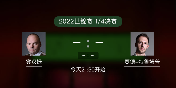 斯诺克世锦赛1/4决赛上:04月26日 21:30 宾汉姆vs特鲁姆普