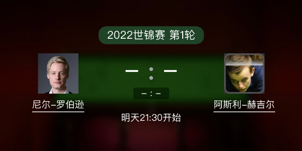 斯诺克世锦赛第1轮上:04月18日 21:30 尼尔-罗伯逊vs胡吉尔