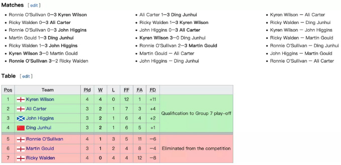 卡特、希金斯和丁俊晖的战绩均为2胜1负,分居第二至四位。希金斯在个人首场比赛中3-0击败奥沙利文,自2021年至今,希金斯已经在「希火大战」中取得6胜1负的战绩,其中包括最近的一波四连胜,追平了职业生涯对奥沙利文的连胜纪录。随后,希金斯在与沃顿的比赛中打出2杆破百,沃顿在第4局可以看到完整红球情况下连续三次击球未能命中红球,被直接判负,希金斯3-1取胜。