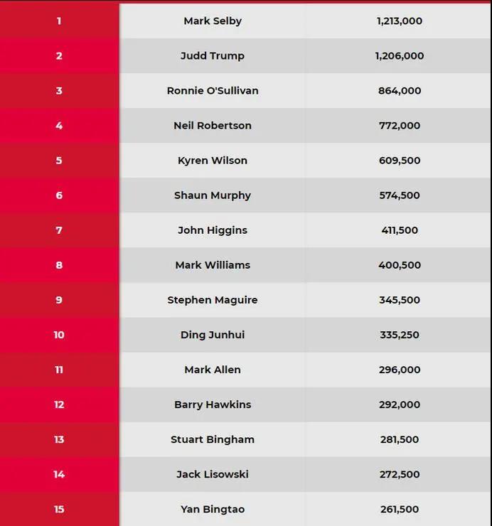 尽管未能在北爱尔兰赛实现四连冠,但打进八强还是让特鲁姆普进账1万英镑,以1199000英镑超过塞尔比,重回世界第一的宝座。