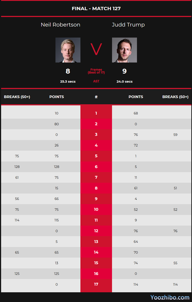 第二阶段开始,罗伯逊又一波高分轰炸,7-4拉开分差,尤其是第10局的一杆75分单局逆转,让特鲁姆普元气大伤。眼看大势已去,小特抖擞精神连追两局。第14局,罗伯逊进攻磕磕绊绊,在超分红球上的致命失误不但未能提前到达赛点,反而让小特回敬一局逆转,双方7-7进入最后的3局2胜。经过一小时拉锯外加僵局重开,小特反倒打单杆55分率先听牌。罗伯逊全场第三次打出破百,追至8-8。决胜局,在罗伯逊开球之后,特鲁姆普出人意料的选择直接长台得手,重压之下一杆破百超分,9-8绝杀罗伯逊,并以18次排名赛冠军数量追平对手。