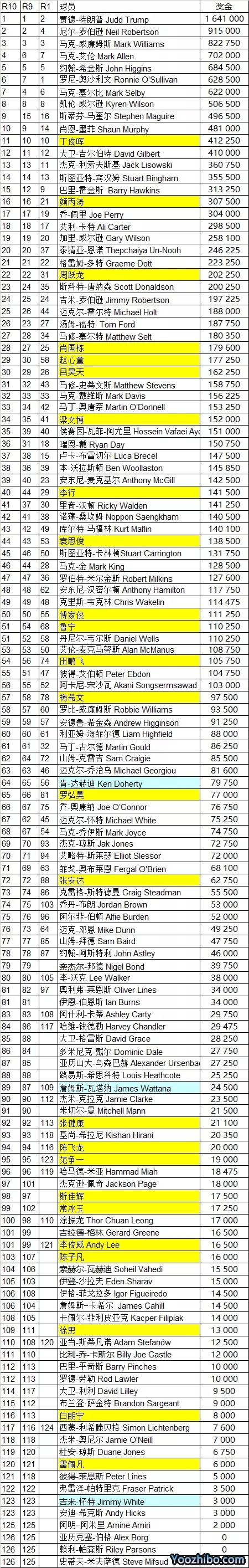 附表:具体排名如下:(排名最终以世界斯诺克官网公布的为准)