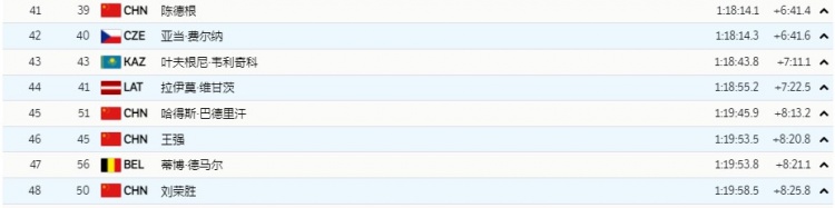 最终,陈德根排名第41(1小时18分14秒1),哈得斯·巴德里汗位列第45(1小时19分45秒9),王强排在第46(1小时19分53秒5),刘荣胜列第48(1小时19分58秒5)。两名俄罗斯奥运队选手博利舒诺夫和亚基穆什金包揽金银牌,挪威选手克吕格尔获得铜牌。