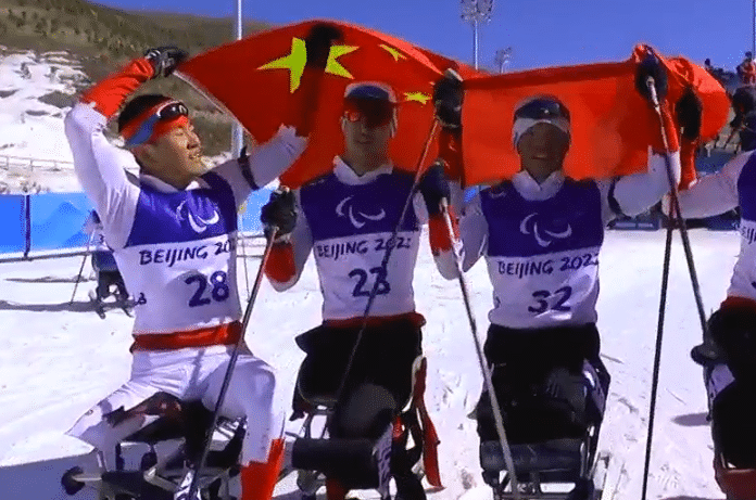 冬残奥会冬季两项男子中距离-坐姿比赛,这个项目中国队总共有4名运动员参赛,刘梦涛、刘子旭、王涛、朱运锋,最终中国选手刘梦涛凭借着出色的发挥获得了这个项目的金牌,这也是中国代表团的第8枚金牌,同时也是刘梦涛个人的第二块奖牌,此前在短项目的比赛里,他获得了一枚铜牌,随后他和其他三名队友一块高举国旗,大喊中国队加油。
