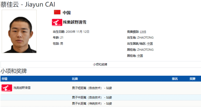 此前在2019年的全国第十届残运会暨第七届特奥会中,蔡佳云夺得1金2铜的好成绩,拿下越野滑雪比赛男子站姿组传统技术1.2公里的冠军、男子站姿组传统技术10公里和男子站姿组冬季两项12.5公里的季军。
