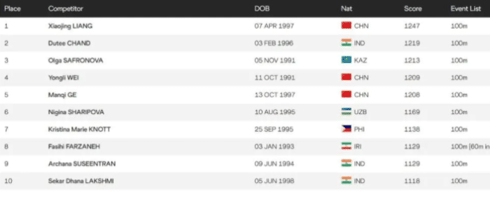 女子100米短跑;梁小静目前以总分1247分,排名亚洲女子100米短跑中位居第一名。虽然是亚洲第一,但梁小静想要杀入到奥运会女子100米决赛,难度依旧很大,所以她在单项的目标是通过预赛,打进半决赛,然后争取杀入到女子100米决赛。