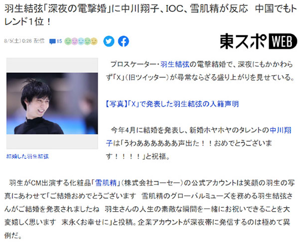 同时日本媒体还关注到了羽生结弦宣布结婚之后,在中国引发的轰动性效应,直言羽生结弦的影响力非常大。最后也祝福羽生结弦,个人生活迈入新的台阶,期待他接下来在冰演的表现。