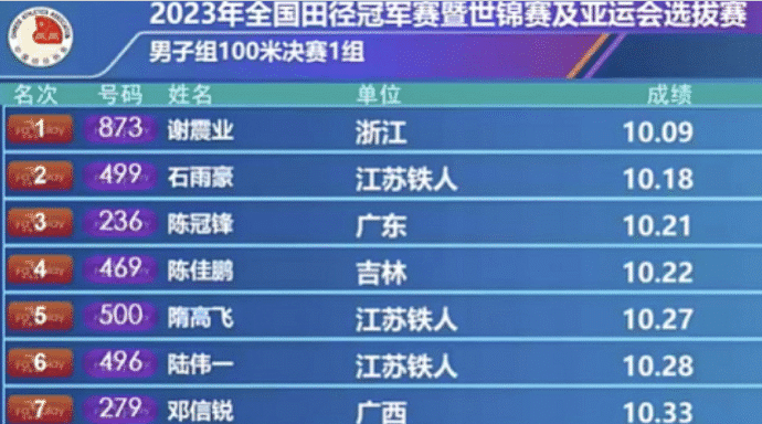 来源:直播车06-28 10:06直播车讯06月28日2023年全国田径冠军赛暨世锦赛及亚运会选拔赛的男子100米决战,谢震业延续良好的状态,他以10秒09夺冠,虽然没有兑现打开10秒大关的承诺,但谢震业的表现还是很出色的。石雨豪10秒18,刷新个人历史最佳,夺得亚军。铜牌属于“最强00后”的陈冠锋,他在决赛中的成绩是10秒21。