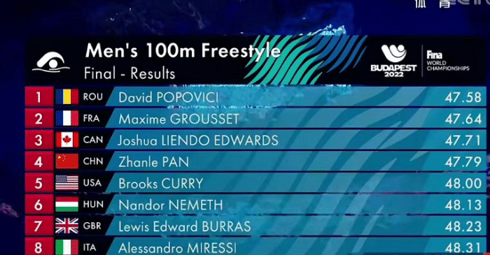 潘展乐在预赛游出48秒19,创造个人最佳成绩。半决赛他又游出了47秒65,一举追平宁泽涛的全国纪录,顺利晋级决赛。47秒65,也超过了宁泽涛2015年喀山世锦赛夺冠的成绩。决赛,潘展乐第7道出发。他的前半程发挥不佳,仅仅排名第7位。但后半程,潘展乐发挥极为出色,最终游出47秒79,排名第4位。