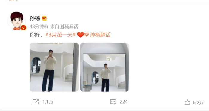 中国昔日泳坛巨星孙杨,在个人社交媒体上晒出两张自拍照。只见孙杨穿着白色毛衣,藏青色长筒裤,穿着皮鞋,正对着镜子记录下自己3月最新鲜的状态。值得一提的是,在前一晚孙杨直播带货到凌晨1点,而且玩出了新花样,可以说非常拼了。