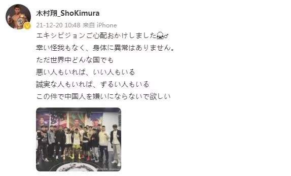 木村翔表现得非常大度,输给玄武后,木村翔表示世界上任何一个地方都有好人和坏人,不要因为这件事怨恨中国人。对于那些了解和支持自己的中国人,木村翔对他们的爱不会改变。木村翔来中国打拳也不是为了捞金,而是出于对比赛的热爱。虽说木村翔是一个日本人,但在这件事上他表现得很大度,展现了格局。而且木村翔还向粉丝们道歉,认为这件事带来不好的影响,粉丝们都觉得非常不解:木村翔没做错什么,他为什么要道歉?