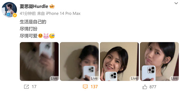 夏思凝拿着手机对着镜子里的自己拍照,然后做出一系列的表情,包括剪刀手、翻白眼、嘟嘴、半遮面等,非常可爱。粉丝们也纷纷留言,称看到这样的自拍,真的爱了爱了。同时夏思凝还在与粉丝的互动中透露,自己休息一天。