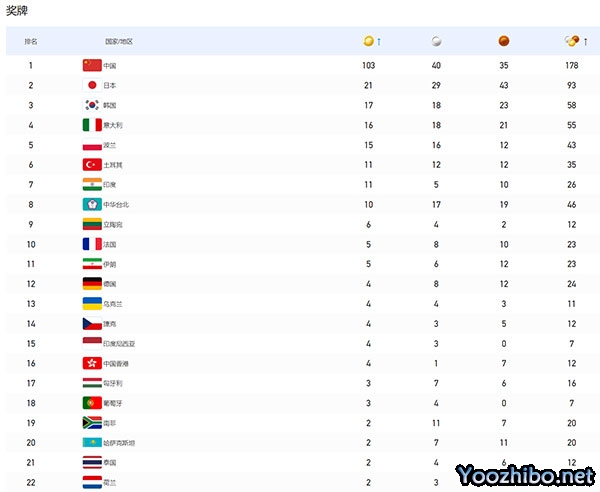 中国体操队9金5银1铜,奥运会金牌得主邹敬园主场作战,人气相当高。邹敬园也表示这是自己参赛以来,气氛最好的一届赛事,给出了极高的评价。