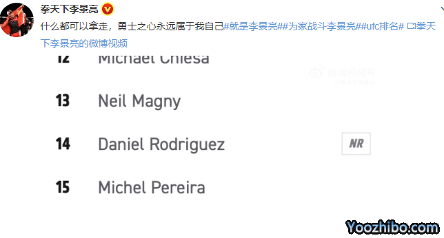 来源:直播车09-13 19:52直播车09月13日,UFC官方公布最新排名,在次中量级的前15名中,已经没有李景亮的名字。李景亮在此前与罗德里格兹鏖战3个回合,通过分歧判定,不敌对手,罗德里格兹则空降榜单第14。如今李景亮看到世界排名之后表示:“什么都可以拿走,勇士之心永远属于我自己。”