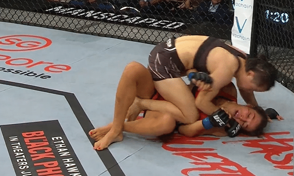 这场比赛是三回合制,第一回合,双方都比较谨慎,乔安娜鞭腿踢几波踢空,张伟丽一记迎击打中。乔安娜突然一腿,张伟丽摔了一下。张伟丽突然近身,把乔安娜给压倒了。张伟丽压制住乔安娜,连续出拳,乔安娜地面防守。张伟丽起身发力,一记砸击,杀伤力十足。张伟丽处于地面压制,乔安娜挣脱不开。两人重新站起来,张伟丽第一回合表现强势,非常精彩。