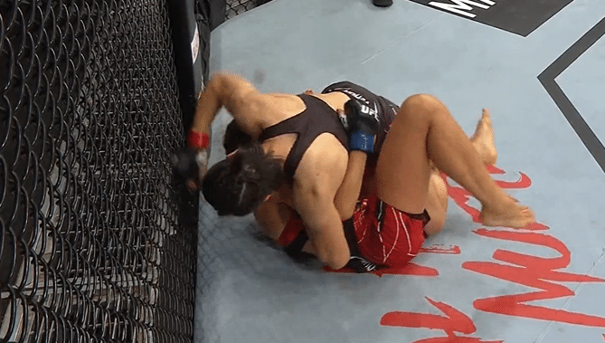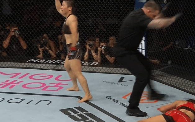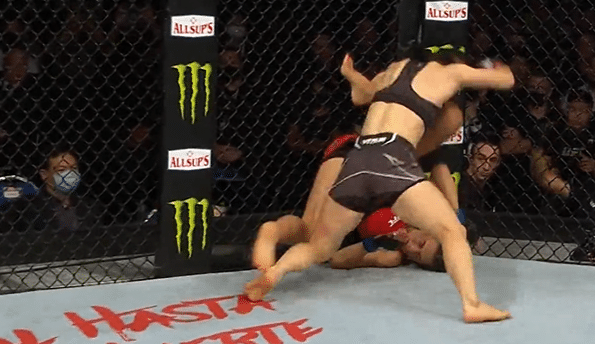 第二回合,现场观众高喊张伟丽的名字,乔安娜尝试鞭腿没打上,张伟丽突然侧身上腿打中了。张伟丽还在找机会进入地面,不过乔安娜身位控制的不错。张伟丽转身肘,直接KO乔安娜,现场疯狂。