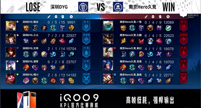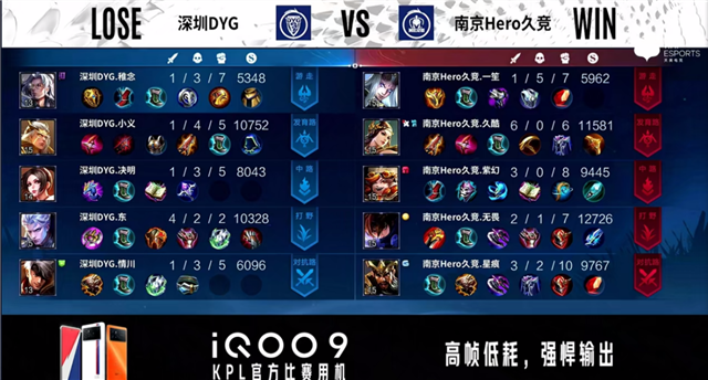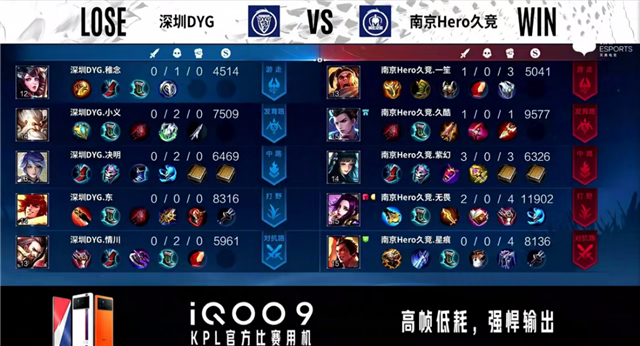 28秒,南京Hero久竞击杀孙膑拿下一血,随后深圳DYG猪八戒反掉南京Hero久竞红buff。2分10秒,深圳DYG控下暴君。3分23秒,南京Hero久竞下路击杀孙膑。5分07秒,深圳DYG上路击杀马可波罗。6分18秒,南京Hero久竞与深圳DYG互换边路一塔,随后深圳DYG控下暴君。7分10秒,深圳DYG先后破掉南京Hero久竞上一塔和上二塔。7分40秒,中路团,双方打出1换1。8分35秒,深圳DYG控下主宰。10分14秒,南京Hero久竞曹操越塔击杀孙尚香。10分36秒,南京Hero久竞控下暗影暴君,随后破掉深圳DYG下二塔。12分27秒,深圳DYG控下暗影主宰。13分26秒,深圳DYG中路击杀盾山。14分20秒,深圳DYG控下暗影暴君。15分30秒,野区团,深圳DYG打出0换4,随后破掉南京Hero久竞中下一塔。16分45秒,深圳DYG拿下暗影主宰。17分53秒,双方上路打出1换1,随后南京Hero久竞控下暗影暴君。18分38秒,南京Hero久竞击杀猪八戒。19分20秒,南京Hero久竞破掉深圳DYG中一塔。20分15秒,野区团,双方打出1换1。20分10秒,中路团,南京Hero久竞打出1换2。23分26秒,南京Hero久竞抢下风暴龙王,随后深圳DYG击杀橘右京。24分54秒,南京Hero久竞破掉深圳DYG中二塔。26分50秒,中路团,双方打出1换1。28分25秒,中路团,双方打出2换2。19分40秒,南京Hero久竞控下风暴龙王,随后团战打出1换2。32分45秒,南京Hero久竞中路击杀孙膑。33分29秒,南京Hero久竞控下风暴龙王。33分53秒,南京Hero久竞先后破掉深圳DYG上下路高地,随后团战击杀猪八戒。35分02秒,南京Hero久竞马可波罗点掉水晶连下三城终结比赛。