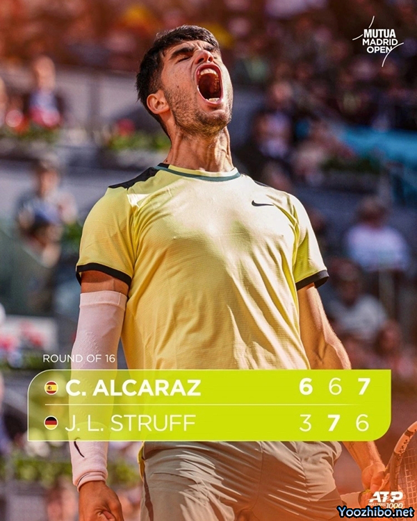 直播车讯 在ATP大师赛马德里站的第四轮比赛中,2号种子阿尔卡拉斯与23号种子施特鲁夫进行了激烈的对抗。最终,阿尔卡拉斯以6-3、6-7(5)、7-6(4)的成绩战胜了施特鲁夫,成功晋级八强2。
