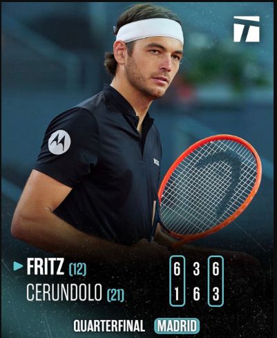 直播车讯 弗里茨和塞伦多洛的比赛是在ATP大师赛马德里站的男子单打项目中进行的。这场比赛进行了三盘,最终弗里茨以6-1/3-6/6-3的成绩战胜了塞伦多洛。