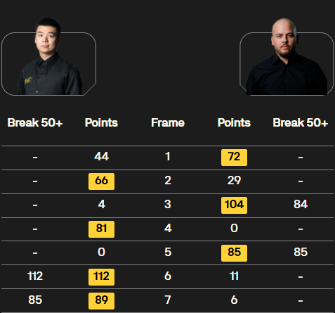 庞俊旭在本局中打出单杆81分,以81-0的比分再次将比分追平,双方战成2-2。