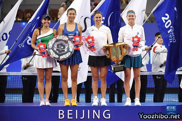 布兹科娃(右一)/托莫(右二)与詹皓晴(左二)/奥尔莫斯(左一)在颁奖仪式上。