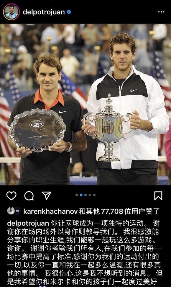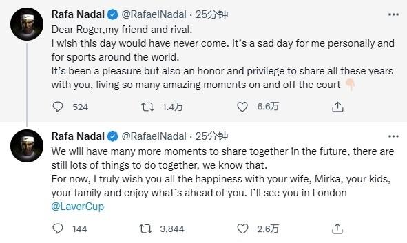 纳达尔写道:“亲爱的罗杰,我的对手和朋友。我希望你退役的这一天永远都不会来,这对于我,对于世界体育都是悲伤的一天。我很荣幸与你一同度过这些年,在场上场上经历这么多难以置信的时刻。未来,我们还会有很多相聚的机会,我知道,我们还会一起做很多事。现在,我真心祝福你与你的妻子、孩子和家庭,愿你们享受之后的生活。我们伦敦见!”