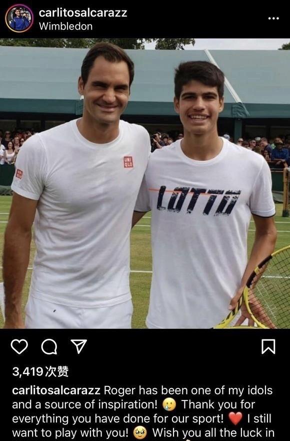 而新科美网男单冠军、西班牙天才阿尔卡拉斯也以迷弟的口吻写道:“罗杰你是我的偶像之一!谢谢你对于网球运动所做的一切,我真的很遗憾没能和你交过手,希望你未来世界一切幸运!”