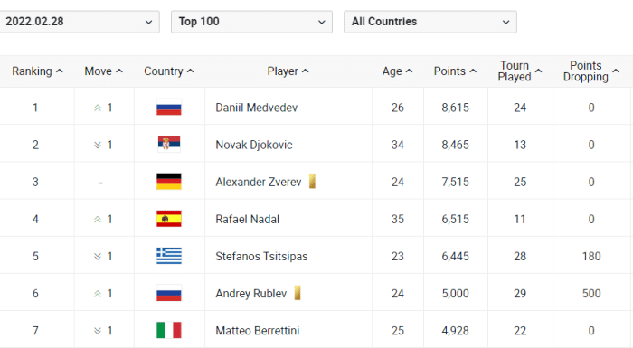 在澳网闯入男单决赛之后,梅德韦杰夫距离登顶世界第一已经只剩下一步之遥。在上一周的赛事中,德约在迪拜赛中止步8强,而梅德韦杰夫在阿卡普尔科赛中赢下一场关键的胜利进入4强。由此,在新一期的世界排名中,梅德韦杰夫以8615分登顶世界第一,德约以8465分排名第二。