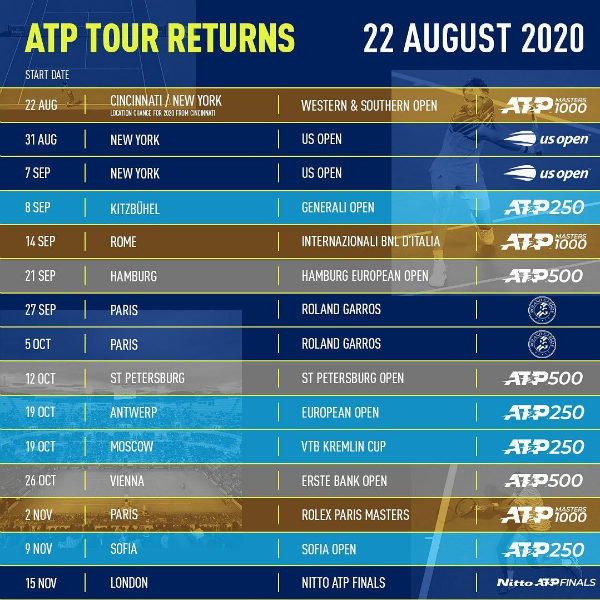 在最新修订的赛程中,ATP1000罗马大师赛将会提前一周进行,填补取消的ATP1000马德里大师赛,紧接着将是ATP500汉堡公开赛和法网。今年的年终总决赛将于11月15日在伦敦拉开帷幕。
