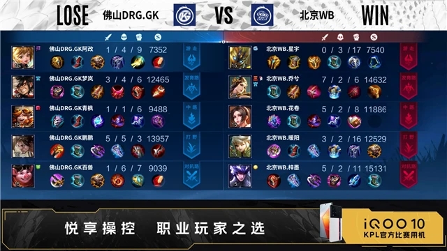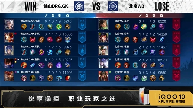 开局佛山DRG.GK中射换线。2分41秒佛山DRG.GK拿下暴君。2分56秒中路佛山DRG.GK击杀嬴政,拿下一血。5分05秒北京WB摧毁敌方发育路外塔,佛山DRG.GK拿下主宰,摧毁敌方对抗路外塔。5分56秒北京WB摧毁敌方对抗路外塔,佛山DRG.GK摧毁敌方发育路外塔。6分57秒北京WB拿下暴君。8分31秒佛山DRG.GK摧毁敌方对抗路二塔、中路外塔。9分29秒佛山DRG.GK拿下主宰。10分14秒中路佛山DRG.GK击杀孙尚香,打出1换2,摧毁敌方中路二塔。11分18秒中路北京WB击杀鲁班七号,拿下暗影暴君。13分33秒北京WB拿下暗影主宰。14分18秒北京WB摧毁敌方中路外塔、对抗路二塔,对抗路佛山DRG.GK击杀孙尚香,澜三连决胜,打出0换4。15分46秒对抗路佛山DRG.GK击杀镜,摧毁敌方对抗路高地,拿下暗影暴君。17分21秒佛山DRG.GK摧毁敌方发育路二塔。20分08秒野区佛山DRG.GK击杀蒙恬,北京WB击杀弈星,双方打出1换1。21分04秒佛山DRG.GK拿下风暴龙王。21分47秒野区佛山DRG.GK击杀镜,北京WB击杀弈星,双方打出1换1,佛山DRG.GK摧毁敌方中路高地,摧毁水晶拿下比赛。