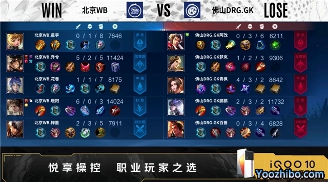 开局双方正常抢线。40秒野区北京WB击杀猪八戒,拿下一血。3分03秒发育路北京WB击杀蒙犽,拿下暴君。3分42秒中路佛山DRG.GK击杀阿古朵,打出0换1。5分02秒北京WB摧毁敌方发育路外塔,佛山DRG.GK摧毁敌方对抗路外塔,拿下主宰。5分43秒发育路北京WB击杀宫本武藏,打出0换1。6分39秒北京WB击杀猪八戒,佛山DRG.GK击杀马超,打出1换2。7分34秒北京WB拿下暴君。8分15秒佛山DRG.GK摧毁敌方中路外塔、发育路外塔,北京WB摧毁敌方对抗路外塔。10分28秒北京WB拿下暗影暴君,击杀沈梦溪,不知火舞二连击破,打出2换2,北京WB摧毁敌方中路外塔。11分42秒佛山DRG.GK拿下暗影主宰,野区北京WB击杀猪八戒,打出1换3,摧毁敌方中路二塔。12分55秒河道佛山DRG.GK击杀虞姬,打出0换2,摧毁敌方中路二塔、高地。14分30秒野区北京WB击杀蒙犽,虞姬二连击破,佛山DRG.GK宫本武藏二连击破,北京WB打出2换4,摧毁敌方中路高地,拿下暗影暴君。16分07秒北京WB拿下暗影主宰,摧毁敌方对抗路二塔。16分31秒对抗路佛山DRG.GK击杀虞姬,北京WB打出1换2。19分16秒中路北京WB击杀宫本武藏,打出0换1。20分03秒高地北京WB击杀孙膑,虞姬三连决胜,打出0换4,团灭对手摧毁水晶拿下比赛。