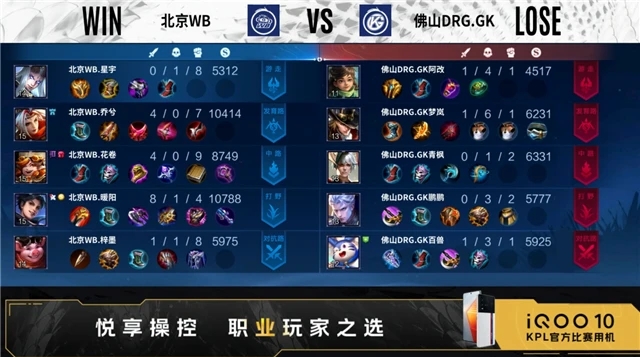 开局佛山DRG.GK边射换线。1分48秒对抗路北京WB击杀大乔,拿下一血。2分36秒对抗路北京WB击杀李元芳,双方打出1换1,北京WB拿下暴君。3分14秒发育路佛山DRG.GK击杀公孙离。4分36秒发育路佛山DRG.GK击杀吕布,打出0换1。5分12秒北京WB拿下主宰,摧毁敌方对抗路外塔,佛山DRG.GK摧毁敌方发育路外塔。6分12秒佛山DRG.GK摧毁敌方对抗路外塔,7分27秒北京WB拿下暴君。8分05秒河道北京WB击杀钟无艳,打出0换1,摧毁敌方中路外塔。9分38秒北京WB拿下主宰,野区北京WB击杀周瑜,打出1换3,摧毁敌方对抗路二塔。10分41秒高地北京WB击杀裴擒虎,摧毁敌方对抗路高地。11分28秒北京WB拿下暗影暴君,13分01秒摧毁敌方发育路二塔、高地,佛山DRG.GK摧毁敌方对抗路二塔。14分47秒对抗路北京WB击杀大乔,澜二连击破,摧毁敌方中路高地,打出0换4,摧毁水晶拿下比赛。