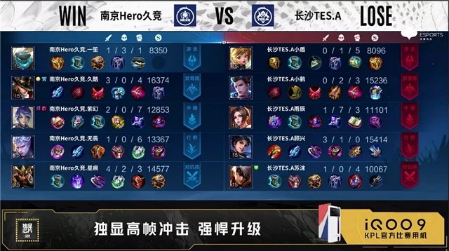 第一局双方常规开局。2分20秒南京Hero久竞拿下暴君。4分05秒南京Hero久竞拿下先知主宰。4分44秒长沙TES.A摧毁敌方对抗路外塔。7分37秒南京Hero久竞拿下暴君。7分58秒南京Hero久竞摧毁敌方发育路外塔。9分钟双方互换边路外塔。9分07秒南京Hero久竞拿下主宰。10分31秒南京Hero久竞拿下暗影主宰。10分40秒暴君处团战南京Hero久竞打出0换2,随后拿下暗影暴君。11分10秒南京Hero久竞摧毁敌方中路外塔。11分47秒南京Hero久竞摧毁敌方发育路二塔。12分08秒南京Hero久竞摧毁敌方中路二塔。14分16秒南京Hero久竞拿下暗影主宰。14分32秒南京Hero久竞摧毁敌方对抗路二塔。15分钟南京Hero久竞拿下暗影暴君。15分56秒南京Hero久竞先后摧毁敌方发育路、中路高地塔。18分03秒南京Hero久竞拿下暗影主宰。18分20秒南京Hero久竞摧毁敌方对抗路高地塔。18分50秒高地团长沙TES.A击杀宫本武藏。19分29秒长沙TES.A拿下暗影暴君。22分钟高地团南京Hero久竞打出1换5团灭对手。22分40秒南京Hero久竞摧毁敌方水晶拿下比赛。