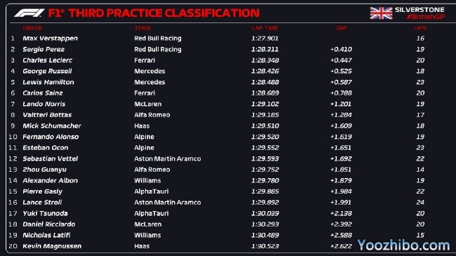 直播车讯 2022年F1英国大奖赛第3次练习赛在银石赛道结束,红牛车队维斯塔潘1:27.901取得三练头名,他的队友佩雷兹第二落后0.410秒,法拉利车队勒克莱尔第三,他落后维斯塔潘0.447秒。两位梅赛德斯车手拉塞尔和汉密尔顿位列四五,第六至第十位分别是:塞恩斯、诺里斯、博塔斯、米克·舒马赫和阿隆索。