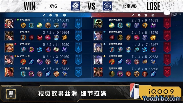 双方常规开局。4分11秒XYG中路击杀张飞拿到一血。4分37秒北京WB发育路击杀大乔。5分40秒XYG摧毁敌方对抗路外塔。6分06秒野区团战北京WB打出0换3。7分03秒北京WB拿下暴君。9分06秒娜可露露拿到主宰。9分21秒发育路团战双方1换1。9分36秒北京WB摧毁敌方对抗路二塔。10分18秒北京WB拿下暗影主宰。10分52秒北京WB拿下暗影暴君。11分22秒北京WB摧毁敌方发育路二塔。12分02秒中路团战北京WB打出0换2。13分17秒北京WB摧毁敌方中路高地塔。13分27秒北京WB摧毁敌方发育路高地塔。14分整北京WB拿下暗影主宰。14分38秒北京WB拿下暗影暴君。15分36秒北京WB摧毁敌方对抗路高地塔。16分11秒高地团战XYG打出2换5,李元芳拿到四连超凡。18分15秒中路团战XYG击杀公孙离。18分26秒XYG拿下暗影主宰。18分54秒XYG拿下暗影暴君。20分45秒北京WB拿下风暴龙王,团战XYG打出2换3。23分56秒发育路团战双方2换2。25分41秒XYG抢到风暴龙王,团战北京WB打出1换2。28分28秒XYG暴君处击杀嬴政。29分19秒XYG拿下风暴龙王并击杀娜可露露。30分32秒XYG摧毁敌方中路、对抗路高地塔。31分19秒XYG对抗路打出0换3。31分30秒XYG摧毁敌方水晶拿下比赛。