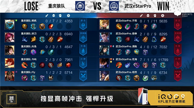开局武汉eStar三人中路抢线。50秒重庆狼队野区击杀孙膑拿到一血。1分13秒中路上河道团战双方1换1。2分整武汉eStar对抗路击杀上官婉儿。4分49秒暴君处团战武汉eStar打出0换3。5分48秒武汉eStar发育路击杀盾山。7分14秒主宰处团战武汉eStar打出0换2。7分54秒武汉eStar中路击杀裴擒虎。8分10秒高地团战武汉eStar打出1换2。9分44秒重庆狼队摧毁敌方对抗路二塔,武汉eStar摧毁敌方发育路二塔。10分27秒武汉eStar拿下暗影主宰。11分50秒发育路团战武汉eStar打出0换5,澜拿到四连超凡。12分05秒武汉eStar摧毁敌方水晶拿下比赛。