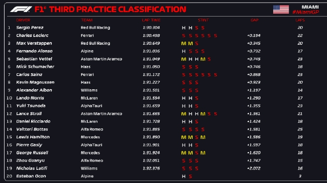 2022年F1迈阿密大奖赛第3次练习赛成绩表: