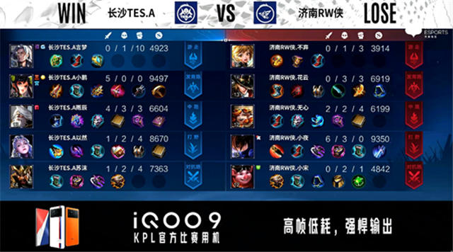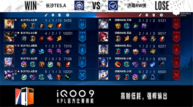 双方常规开局。2分10秒济南RW侠拿下主宰。2分47秒长沙TES.A中路击杀夏侯惇。3分49秒济南RW侠对抗路击杀澜。4分09秒济南RW侠拿下暴君。4分12秒济南RW侠野区击杀嬴政。6分05秒双方对抗路1换1。7分52秒济南RW侠主宰处击杀盾山。9分21秒济南RW侠拿下暴君。9分36秒中路团战长沙TES.A打出1换2。10分19秒长沙TES.A拿下暗影暴君,济南RW侠拿下暗影主宰。11分14秒济南RW侠摧毁敌方发育路二塔。12分23秒济南RW侠摧毁敌方对抗路二塔。12分57秒野区团战长沙TES.A击杀夏侯惇。14分41秒济南RW侠摧毁敌方中路外塔。14分55秒济南RW侠拿下暗影主宰。15分18秒中路团战济南RW侠打出2换3。16分21秒济南RW侠拿下暗影暴君。17分01秒暴君处团战长沙TES.A打出2换4。17分36秒长沙TES.A摧毁敌方中路二塔、高地塔。18分56秒长沙TES.A摧毁敌方对抗路二塔。19分32秒长沙TES.A摧毁敌方发育路二塔。21分17秒龙王处团战长沙TES.A打出0换3。21分45秒长沙TES.A摧毁敌方水晶拿下比赛。