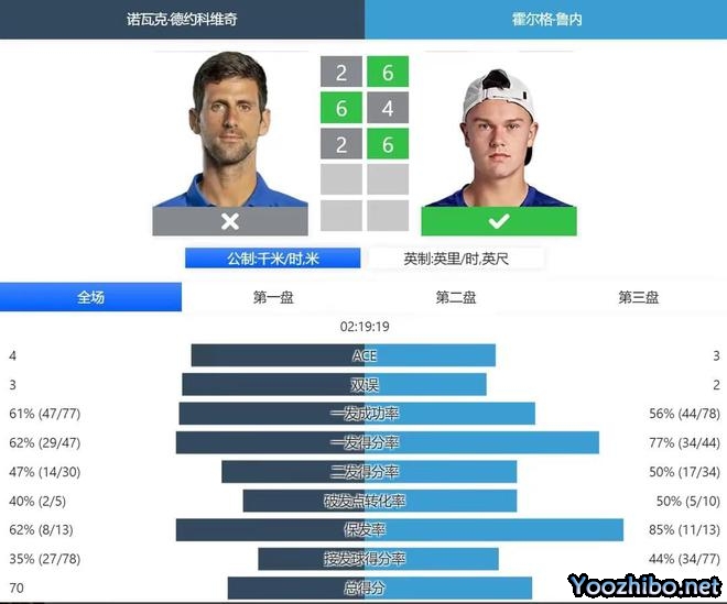 决胜盘上来,鲁内连破带保2-0,第3局,鲁内再次破发3-0,第4局,鲁内再次保发4-0扩大优势。第5局,德约科维奇终于是保发追到1-4,鲁内随后再次保发5-1。第7局,德约科维奇艰难保发2-5。第8局,鲁内兑现发球胜赛局6-2,拿下大比分2-1晋级。