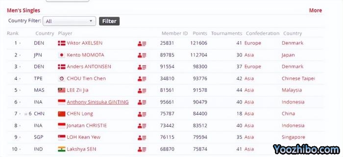 男单排行当中,此次新加坡公开赛走的最远的中国选手赵俊鹏止步半决赛,但这个成绩让他成功的把排名暂时提升到了第17位,李诗沣也有小幅度进步来到了第36,其他中国选手获得排名保护的老将谌龙依旧位居第七,被国羽队内禁赛的石宇奇第17,陆光祖第25,翁泓阳位列第50,男单榜首依旧是东京奥运会冠军丹麦名将安赛龙。日本选手桃田贤斗,另外一位丹麦名将安东森排名二三位。