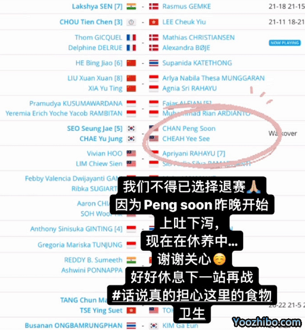 这件事情最开始被报道出来的食物中毒的是马来西亚名将、奥运会银牌得主陈炳橓上吐下泻,被迫退出双打的比赛。
