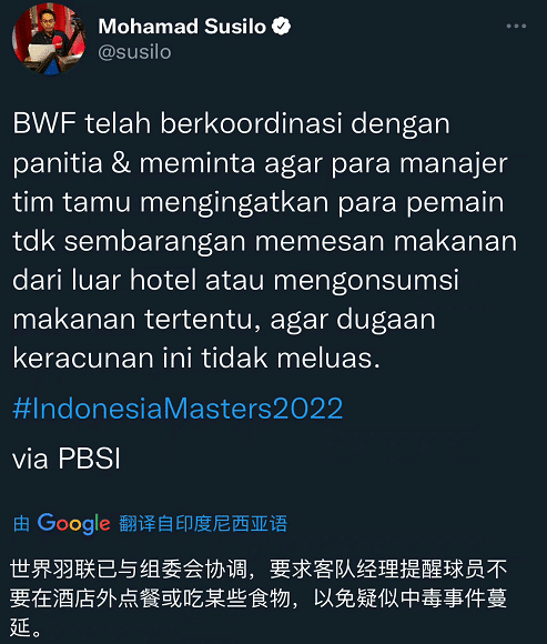针对这一系列的事情,印尼羽协表示:“世界羽联已与组委会协调,要求各队球员不要在酒店外点餐或者吃东西,以免疑似中毒事件蔓延”